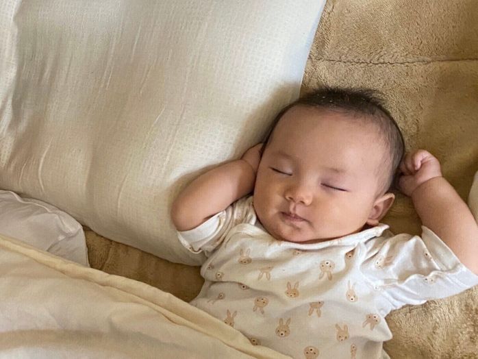 「私だけ起床。洗濯機を回したら、パパと息子が寝ているベッドに再びゴロン。両手を上げて眠る、息子のこの姿にキュン!とします(笑)」(高橋さん)