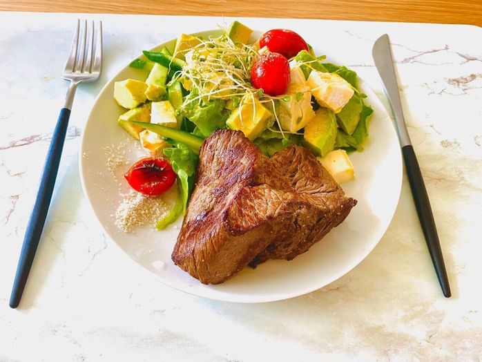 「授乳後、息子は昼寝。その間に、私とパパのブランチを準備。ステーキとサラダを食べるのが、わが家のルーティンになっています。ステーキは、グラスフェッドビーフという、牧草だけを食べて健康に育った牛のお肉がマスト。メニューを決めておくと、ごはん作りもラク!」(高橋さん)