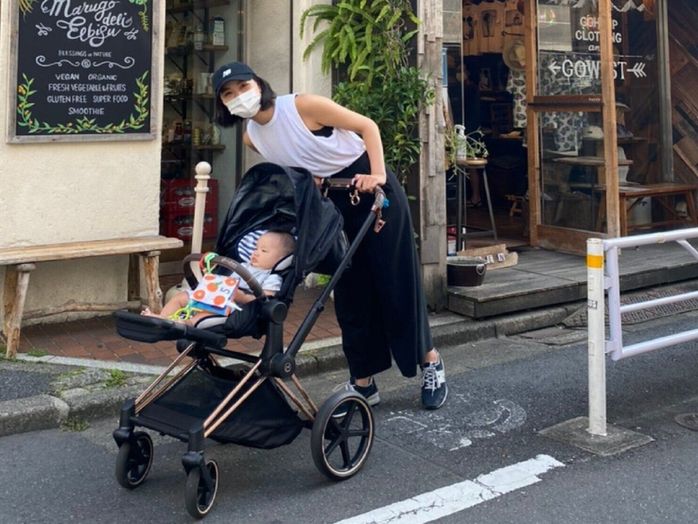 「家族3人でお散歩へ。お散歩のときは、息子をベビーカーに前向きに座らせるとご機嫌です。朝と夕方の空気の違いを感じてほしいので、お散歩は1日に2回行くようにしています」(高橋さん)