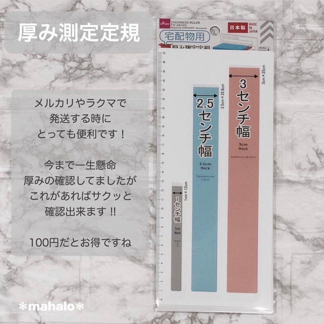 * mahalo *さんが購入したのは厚み測定定規。クリックポストやゆうパケット、ネコポスなどは厚さの規定が設けられているので戸惑うことも多いのでは?でもこの測定定規があれば簡単に厚さを確認することができるので、発送作業がスムーズになりそうですね。