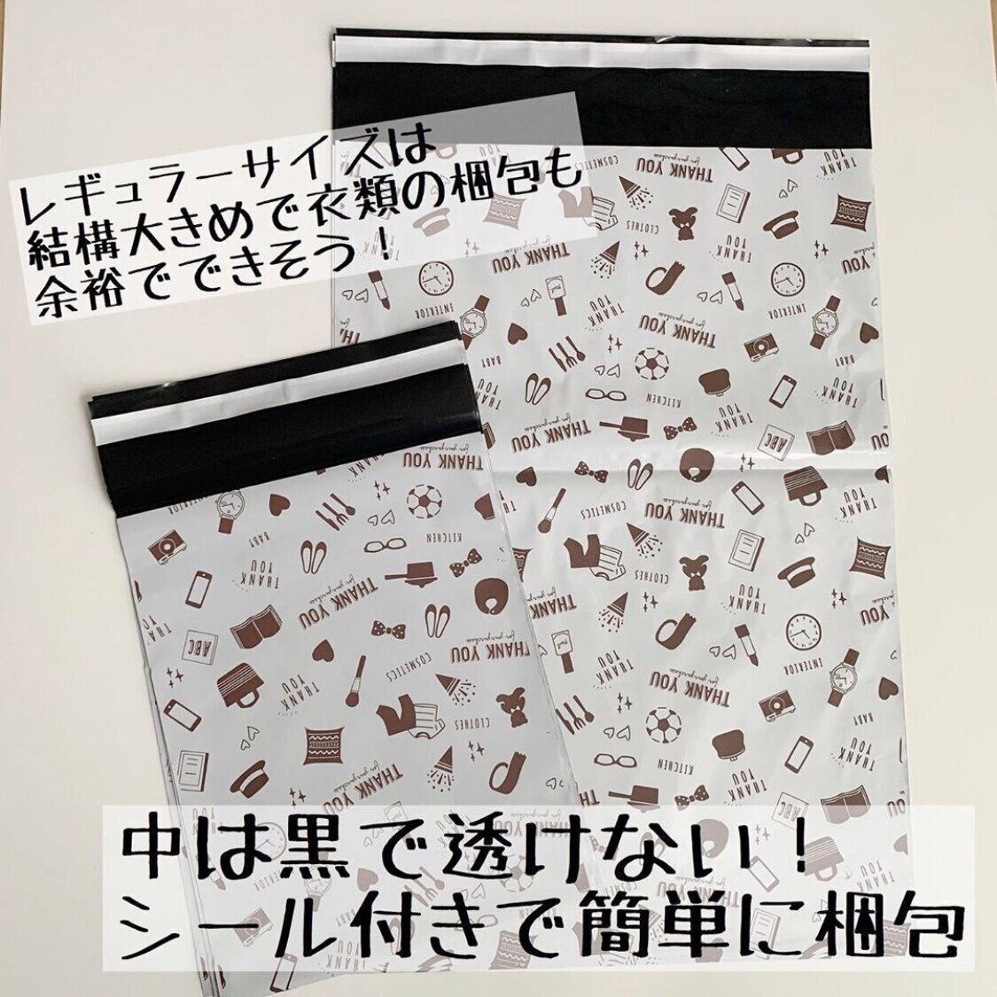 Cocoさんが購入したのは発送用ビニールバッグ。最近はこのような宅配用のビニールバッグが流通していますが、なんとダイソーでも入手できるそうです。裏地は黒いので内容物も透けにくく、シールで簡単に封かんもできるみたいですね。