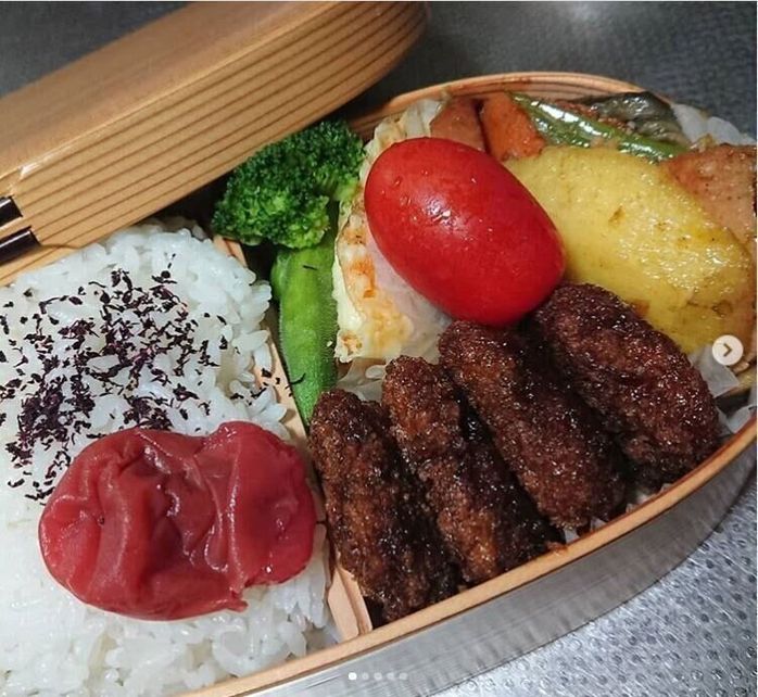 おしゃれな曲げわっぱのお弁当箱に息子さんのお弁当を作ったnene152928さん。お弁当真ん中の肉団子は冷凍食品なんだそうですよ。他のおいしそうなおかずとも違和感なく、とてもおいしそうですよね。