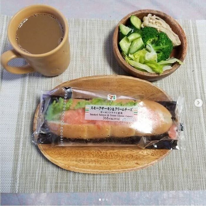 カフェに出てきそうなおしゃれな「スモークサーモン&クリームチーズ」を購入した“も”さん。サラダ・フルーツ・コーヒーと共に朝ごはんにしたそうですよ。忙しい朝でもしっかり朝食がすぐに作れて助かりますよね。