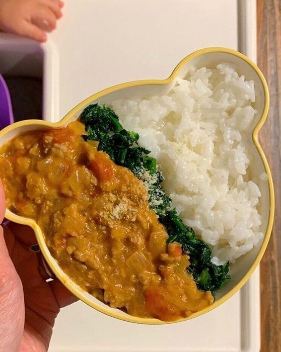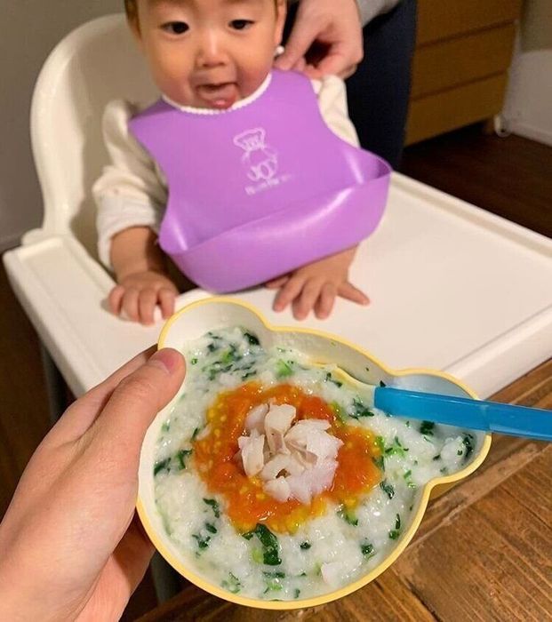 息子さんが7~8カ月ごろに作っていたレシピ。ごはんにほうれん草、牛乳、粉チーズを入れて混ぜ、刻んだミニトマトとたらをのせたリゾット。息子さんは、ミルクリゾットや豆乳リゾットが大好きなんだとか。