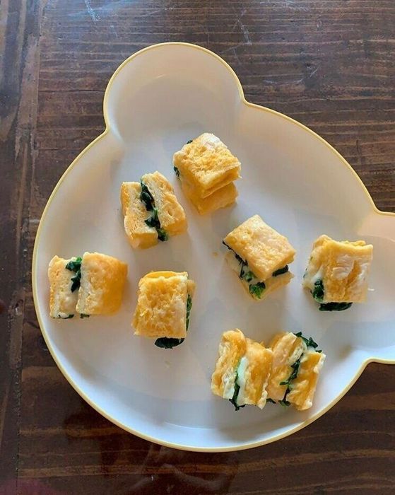 卵と牛乳を浸した食パンを電子レンジで加熱して蒸しフレンチトーストを作ります。ヨーグルトをあえたほうれん草と、スライスチーズを挟んで小さく切ったら出来上がり。