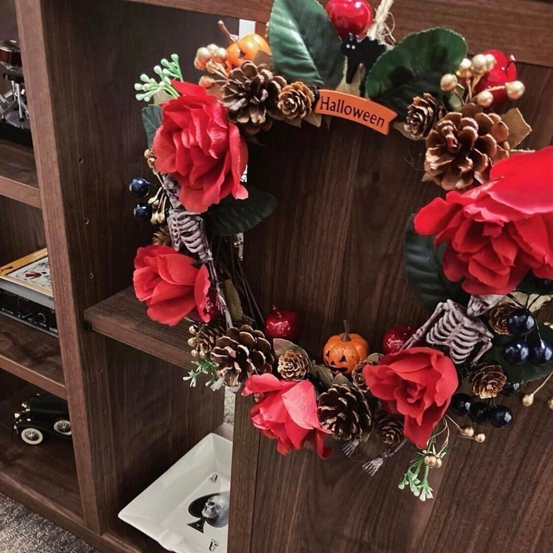 ぷさんがさんが作ったのは、赤い花とまつぼっくりがメインのハロウィンリース。リースを掛ける場所にマッチしたデザインですね。すべての素材を100均で揃えたので、材料費は2,000円程で収まったそうですよ。