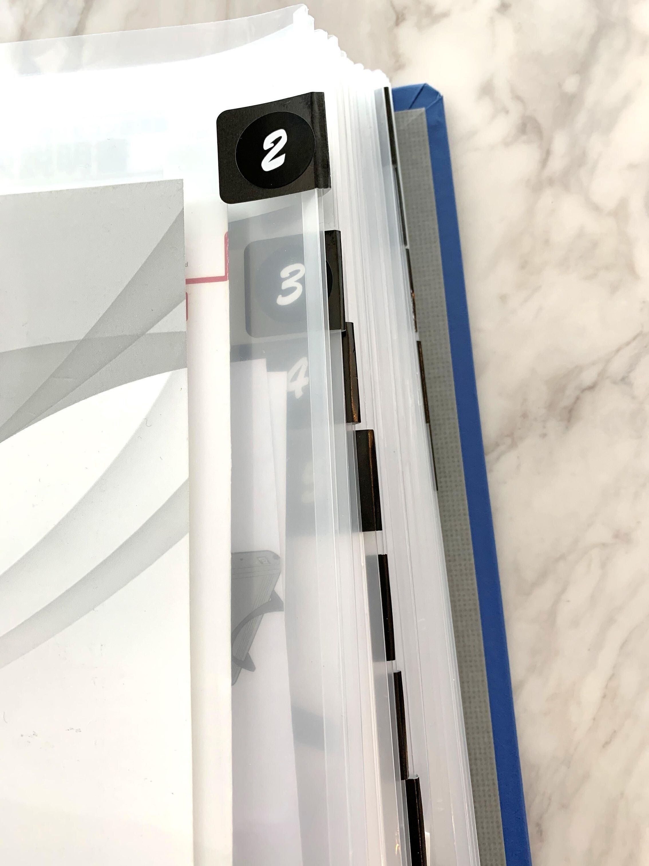 この時、ホルダーファイルにも「番号シール」を貼っておきます。番号シールは100均のタッグシールに手書きで番号を書いてもOK。シールを貼る時は写真のようにずらして貼ると、番号が見つけやすくなります。