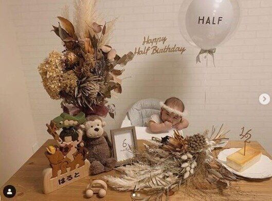 SHIORIさんは大きなドライフラワーや風船、ケーキなどをセットにハーフバースデーの写真を撮影。2束ある大きなドライフラワーがとってもおしゃれですね。