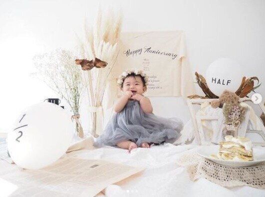 Mayさんは秋らしいドライフラワーややわらかい配色の花冠などを取り入れてハーフバースデーの写真を撮影しました。グレーのチュールドレスも可愛い!笑顔がとても素敵な1枚ですね。