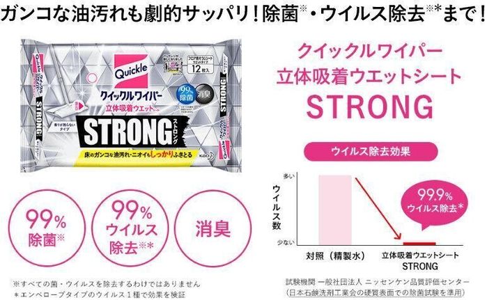 「クイックル ストロング」は強力タイプの床用ウェットシートなので、普段の掃除をしながら、手間なく除菌(※)・ウイルス除去(※*)できます。