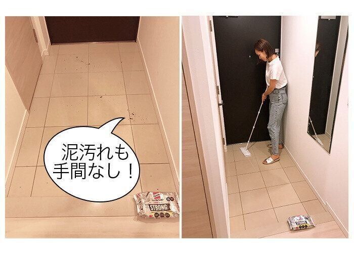 みんなが出入りする玄関は、外からいろんなものを連れてきがち(笑)。砂や泥はもちろん、菌やウイルスも気になります。泥がついていると水拭きが必要だから手間がかかっていたのですが、『クイックル立体吸着ウェットシート STRONG(クイックル ストロング)』なら、サッときれいに!手も汚れず、掃除が楽しくなりました。
