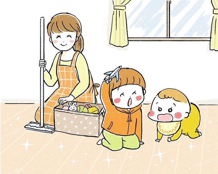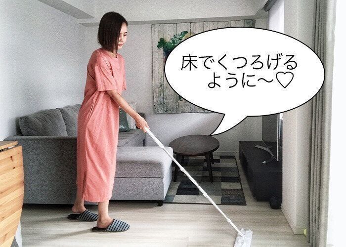 朝、家族が起きてくるまでの貴重な時間に、ササっと掃除ができるのが◎! そして、拭いてみると想像以上に汚れが付いていたのでびっくり。フローリングがサラサラになって気持ちがいいし、除菌(※)やウイルス除去(※*)もできる点もいいですね。起きてきた子どもたちも、リビングの床でくつろいでいます。