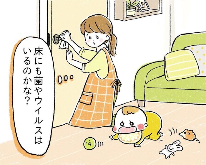 除菌やウイルス除去というと、ドアノブやテーブルなど、みんながよく手で触れる場所に目がいきがちですが、他にも気をつけたい場所はありませんか? 小さいお子さんにとって「床」は手で触れる場所。
