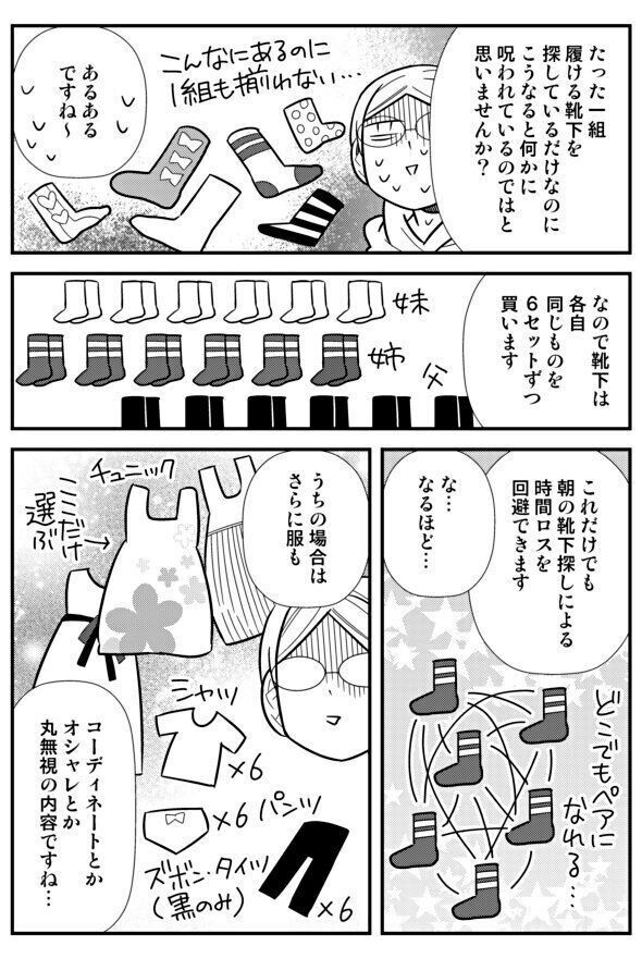 コレおもしろいのが、同時期に買った6着(ズボンや靴下)がほぼ同時期に穴が開いたりなどで廃棄になるので、次の物を買うときも揃えて6着買え、わかりやすく管理しやすいです。全員同じ柄(全員黒など)にしてしまうとサイズ違いでペアを作るのがめんどくさくなるので、人物ごとに柄、色は変えた方が良いです。