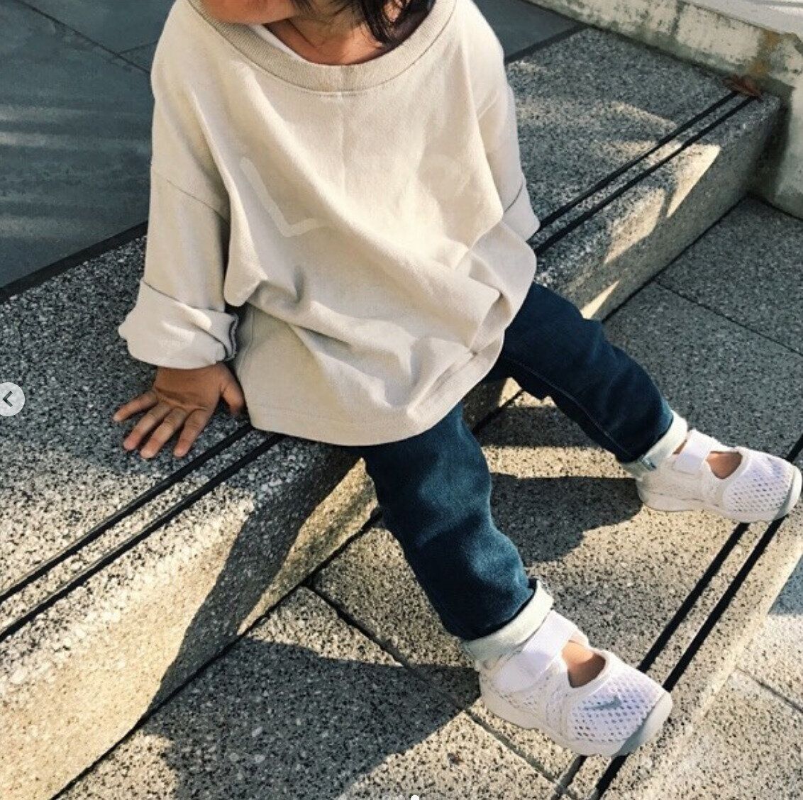 HalさんはこちらのデニムをGET!大きめのトップスと合わせて、ゆるっと着こなしているのが可愛いですね。店頭のスタッフさんからのおすすめだったそうで、この色なら親子リンクコーデもしやすいんだとか♪