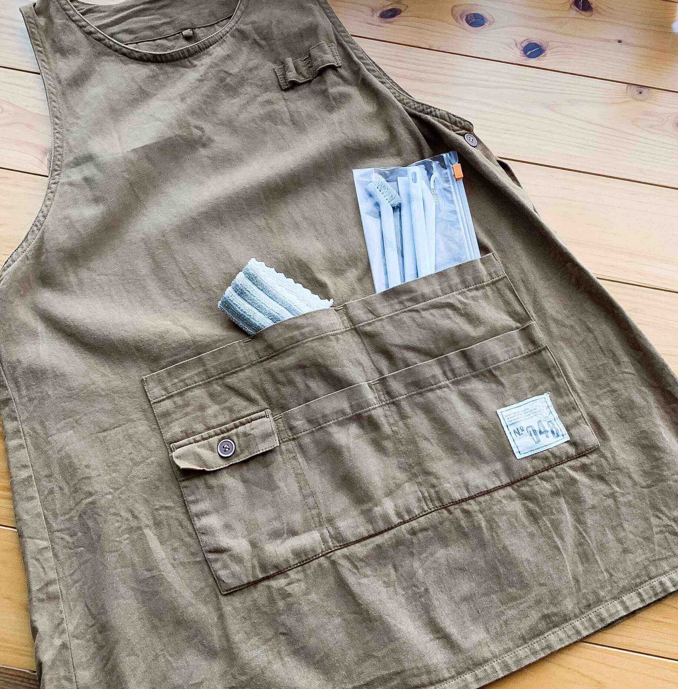 水谷さんは、家事タイムにつけるエプロンのポケットの1つに、無印良品の隙間掃除シリーズを、もう1つのポケットに古タオルをスタンバイ。何かをしながら、何かのついでに、いつでもサッと掃除をしているそうです。