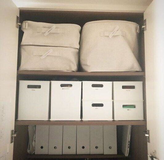 oyukiさんはリビングクローゼットの収納にニトリのNインボックスと無印良品のソフトボックスを活用。どちらもクローゼットにぴったりと収まっていますね。