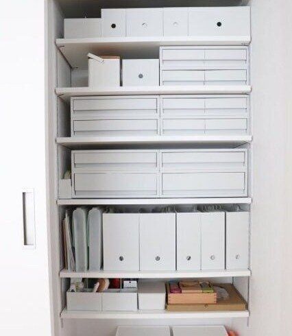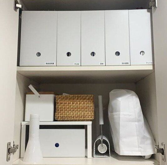 mary_homeさんはリビングクローゼットの収納にファイルボックスやカゴなどを活用しています。クローゼットの中には書類やミシン、ソーイングセットなどが入っているそうです。ファイルボックスにもラベリングがしてあるのでわかりやすいですね。