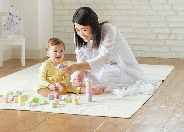 やわらか素材のどうぶつパーツが5種類、パステルカラーのつみきが24個入ったつみきセット。生まれてから5カ月ごろまではにぎったりなめたり、1才を過ぎればつみきを積んだり打ち合わせたり、成長に合わせていろいろな遊び方ができるところが人気。