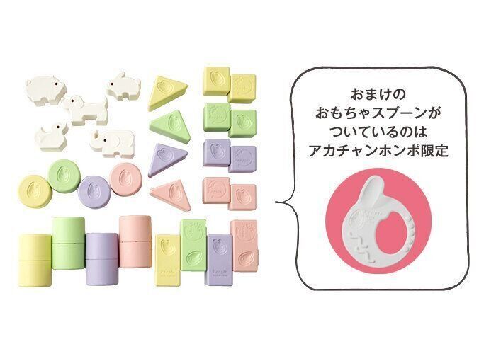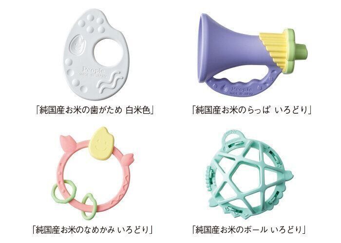 ピープルの「お米のおもちゃ(R)」は、国産米を原料にしたエコなプラスチック「ライスレジン(R)」を使用。また、原料の35~51%がお米で、無塗装であることが、なんでも口にする赤ちゃんにうれしいポイントです。遊びながらお米のにおいに慣れておけば、離乳食もスムーズに始められますよ。