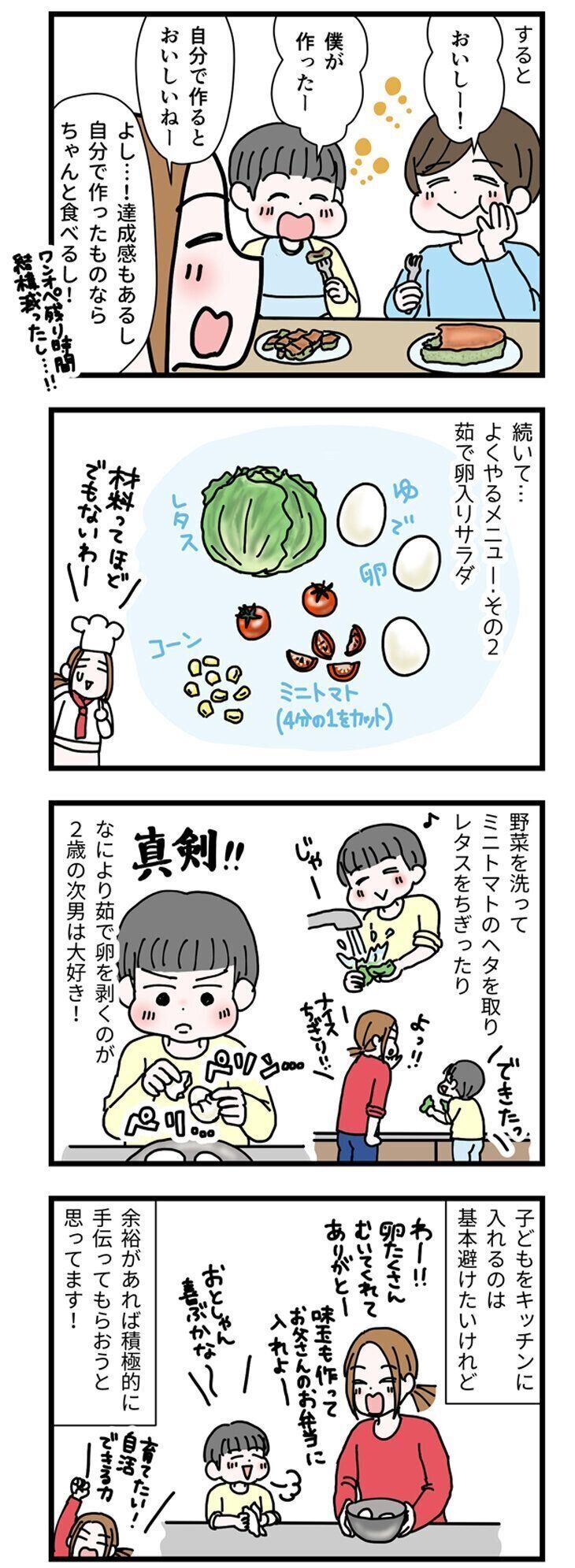 でもちょっとした遊び感覚で簡単な工程を任せるのも、本人たちが達成感を味わえるし、私が作る様子を見るのも勉強になるかなと思って、一緒に料理しています。