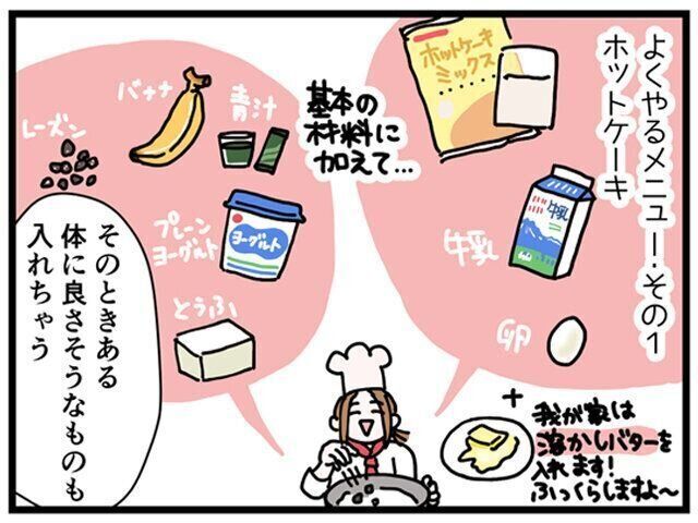 ホットケーキは朝食、昼食、おやつにもなるし、あれこれ入れられるので栄養バランスもいいかなーと思って頻出メニュー。青汁を入れれば普段は嫌がって食べない青菜成分も摂取できるし…!
