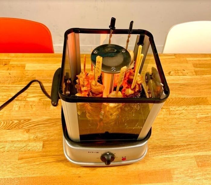 これは見た通りの家電なのですが、好きな肉・野菜などの具材を串に刺してセットするだけ。スタートするとくるくると回転しながらヒーターで食材をムラなく加熱してくれる上に、煙がとても少ない点が◎。付属の串で好きな食材を刺して焼くもヨシ、「肉のハナマサ」で売っているような“冷凍焼き鳥”をそのまま焼くも良し。個人的には肉厚の椎茸やイカなんかも反則的な旨さに仕上がります。