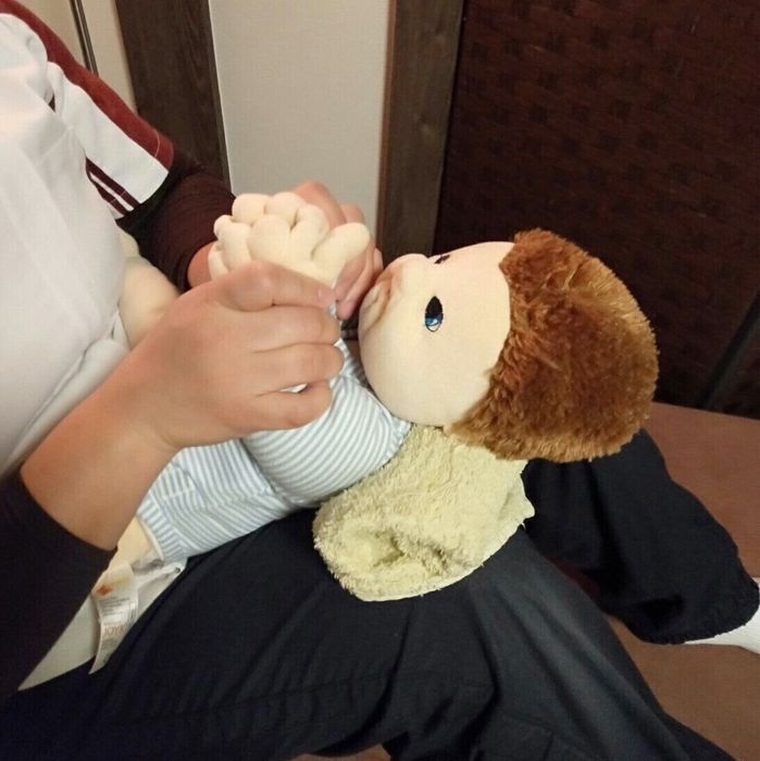 ママ(パパ)は、壁などに体をもたれかけさせて座り、両脚の上に赤ちゃんを寝かせます。赤ちゃんの両脚は開いて、ママ(パパ)の体をまたがせるようにします。赤ちゃんの頭が下がらず、あごをひく姿勢が取れるように、深い位置に寝かせ、首の下に、タオルなどを敷くといいでしょう。少し大きい子は、床に寝かせてもかまいません。