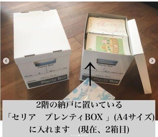 つだゆかりさんはたくさんあるプリントをセリアのプレンティBOXに入れて保管しています。たくさん入るボックスは、捨てたくないけどたまってしまうプリントの収納には良さそうですね。