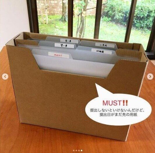 Kana Nakagawaさんはプリント類を習い事や幼稚園、学校などに分けて収納しています。行事やイベントごとにクリップで留め、時系列に並べているのだとか。提出しなければいけないプリントも「MUST!!」と書かれたフォルダの中へ。これならうっかり忘れてしまうこともなさそうですね。