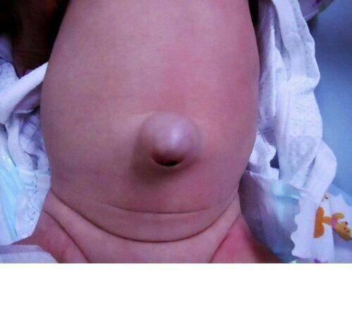 開存した臍輪から腸管が脱出して、おへそがふくらんだ状態です。