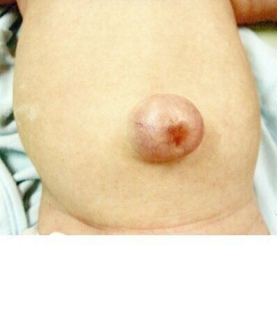 開存した臍輪から腸管が脱出して、おへそがふくらんだ状態です。