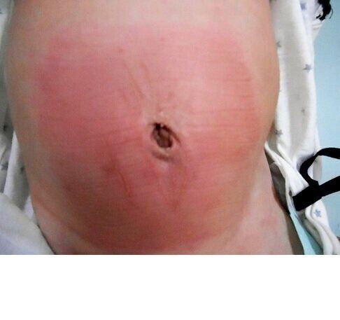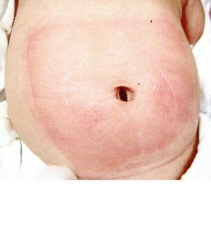 おへそが突出した状態で、その中に腸管が飛び出ているのが「でべそ」