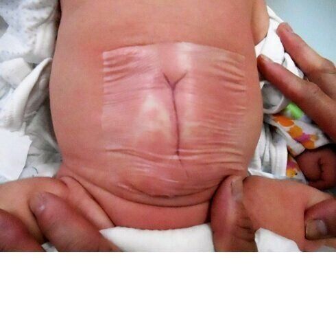 綿球圧迫療法のメリットは、治癒率の高さと、合併症が少ないことでしょうか。治癒率は全体で90%以上です。[写真4・5]に成功例を示しましたが、大きな臍ヘルニアが2カ月間の綿球圧迫療法で、きれいなへこみが形成されました。皮膚のかぶれが唯一の合併症です。