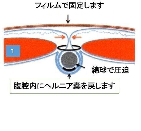 綿球を挿入して、ヘルニア嚢を押し込み、腹壁を引き寄せてフィルムを貼ります。