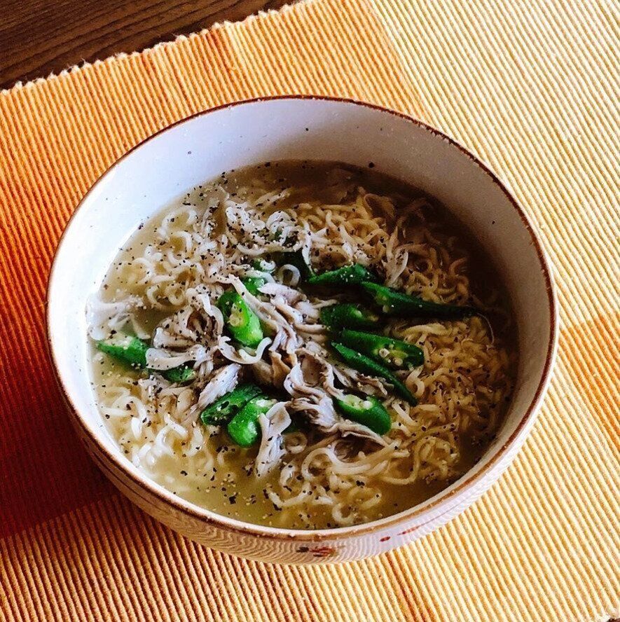 rio83keiさんはお昼ごはんにこちらのアレンジを。舞茸とオクラの塩ラーメンだそう。ブラックペッパーを上からかけたら完成!こしょうがピリッと効いて美味しそうですね。