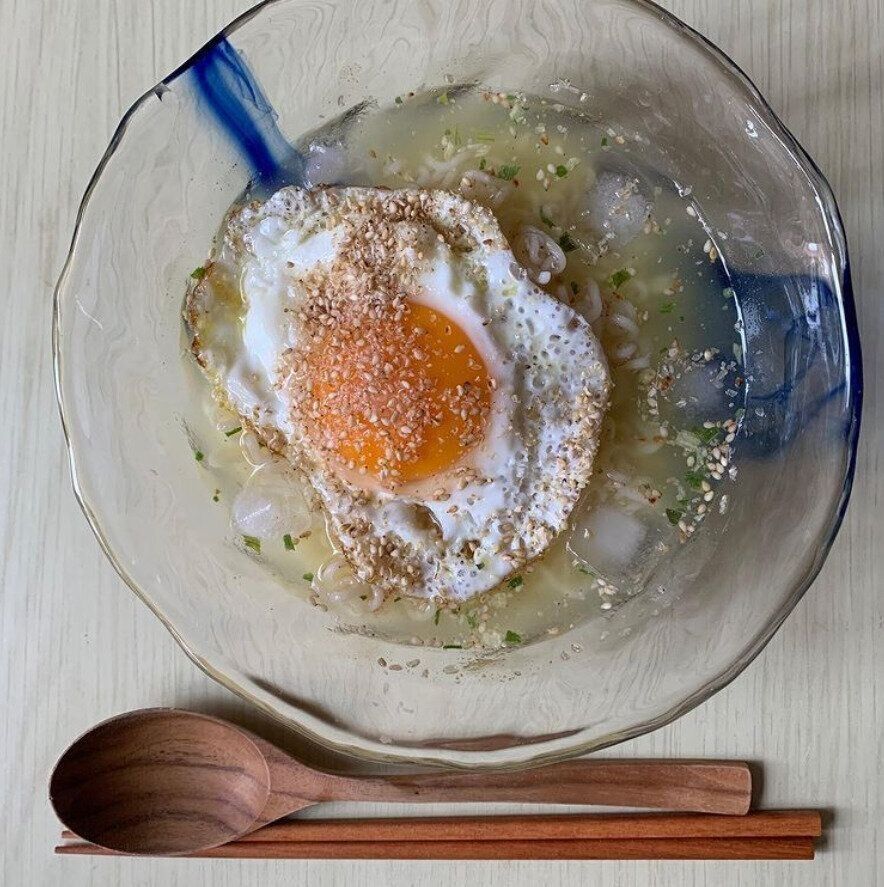 まるこさんはこちらの冷製にアレンジ!これなら食欲がないときでもツルっと食べられそうです。トッピングの目玉焼きもインパクトがありますね!食べてみたくなりますよね。