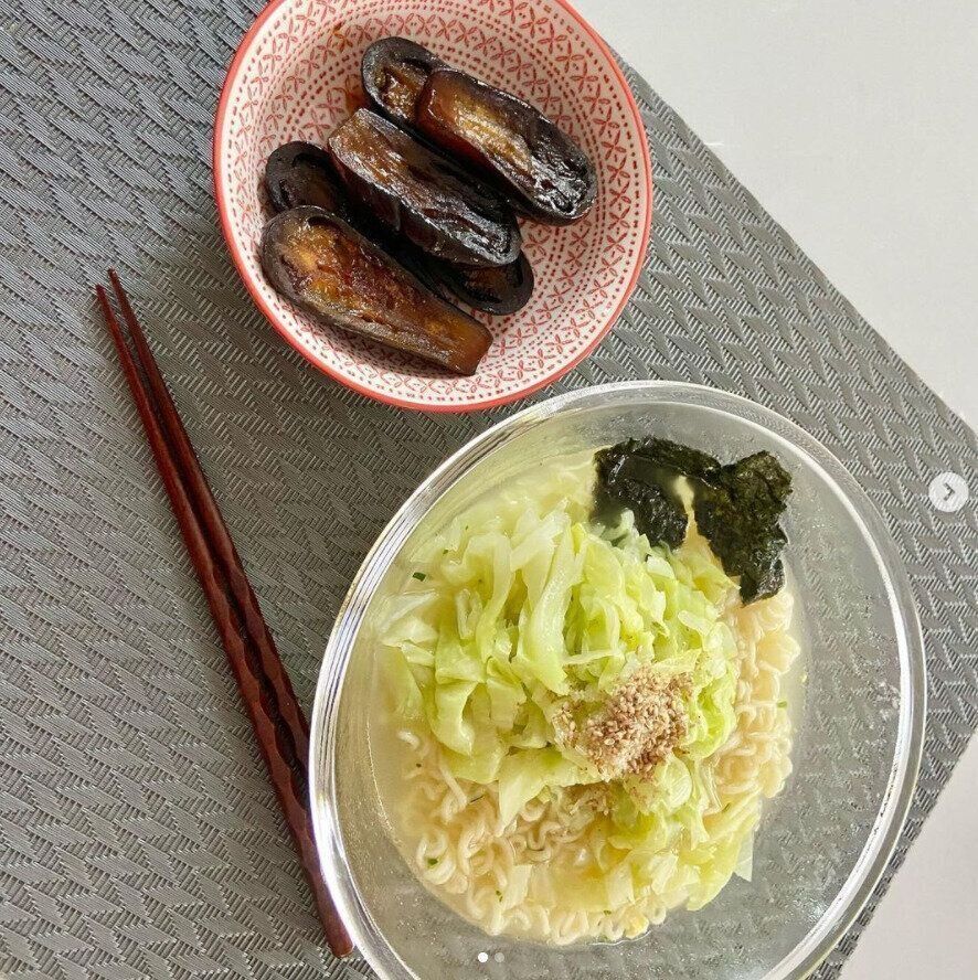 mi mamaさんはキャベツをたっぷり乗せた塩ラーメンを。昔からこちらのアレンジ法がお気に入りで、この食べ方が一番好きなんだとか。付け合わせのナスの蒲焼きも美味しそうですね!