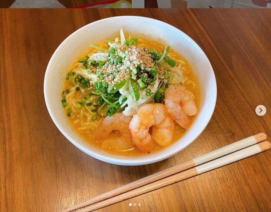 Y・Kinoshitaさんはこちらのアレンジメニューを。カルディでゲットしたトムヤムクンパウダーを入れてちょっぴり刺激的にしたそう。その上に玉ねぎ・豆苗・挽肉・万能ねぎ・海老・白胡麻を乗せて完成!コレは美味しそうですね!