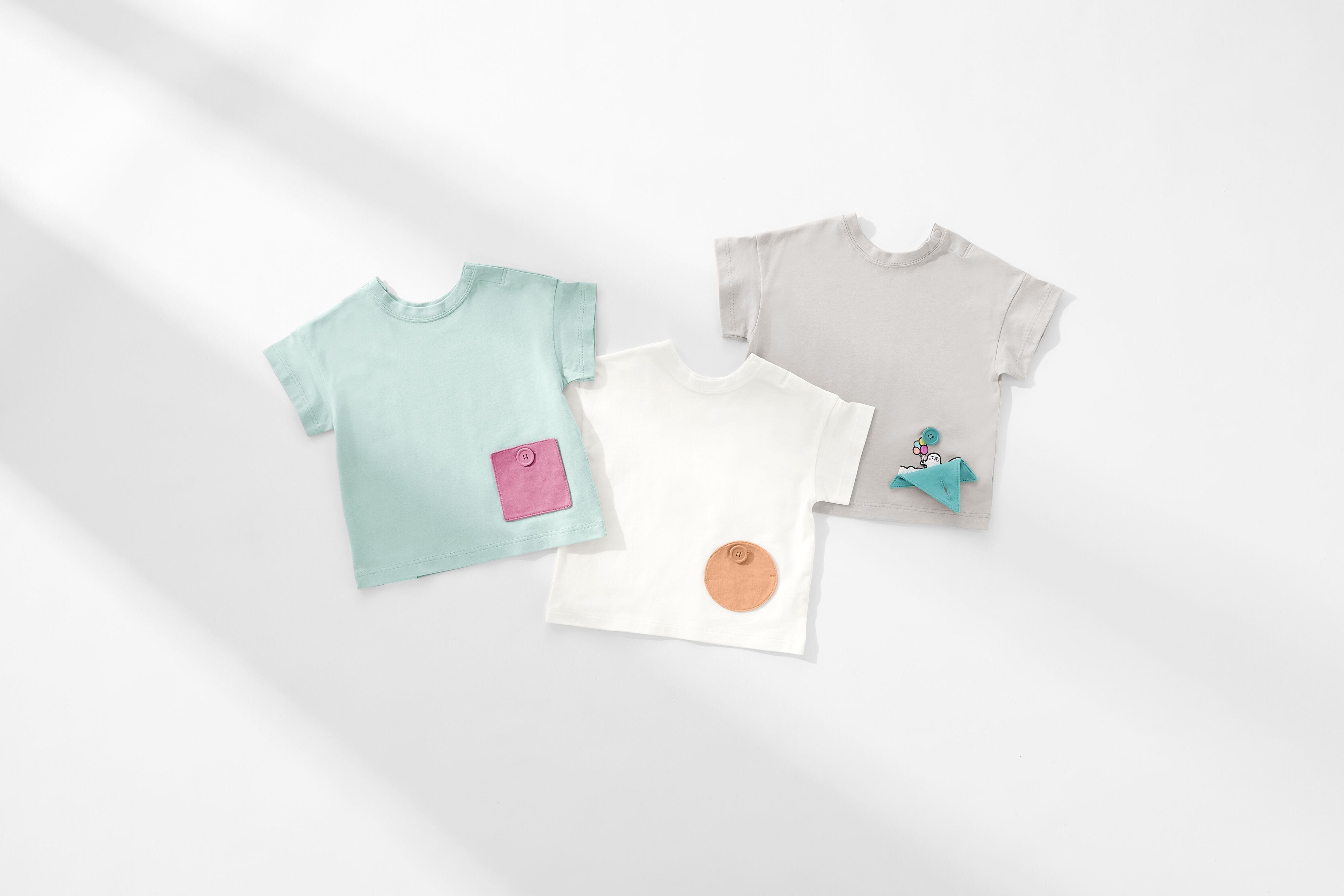 まずは、シナぷしゅジユウT(1,290円)。一見白いTシャツに丸や四角のポケットがついたおしゃれなデザインですが、ボタンを開けてみると…なんと、ポケットの中は別世界! 丸いポケットからはシナぷしゅや海の生き物、四角いポケットからは星やロケットなどの刺繍が現れます。