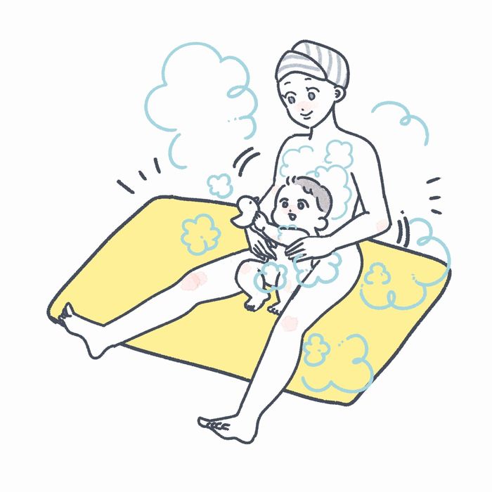 バスマットの上に大人が座り、赤ちゃんを大人の脚の間に座らせて太ももでホールドすると、ある程度、動きを止められて洗いやすくなります。また、おもちゃで遊ばせている間に、サッと洗うのも手。