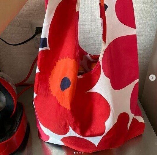 もぐりんさんは大きな赤いウニッコ柄のエコバッグを使用しています。マリメッコのエコバッグはたくさん入るので重宝しているそう。大胆なデザインで可愛いですね!