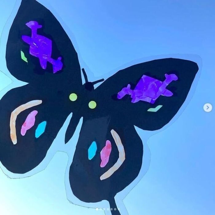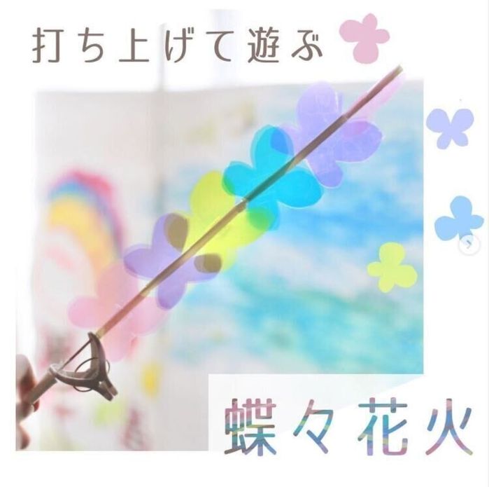この工作は、一番下の洗濯ばさみをつまんで(縮めて)離すと、弾かれた蝶々がぱっと棒から飛び立ちます。とてもきれいな蝶々は、100円ショップDAISOの透明折り紙で作ったそうですよ。動きのある工作は子どもたちも夢中になりそうですよね。身近な材料で作れるのも◎!
