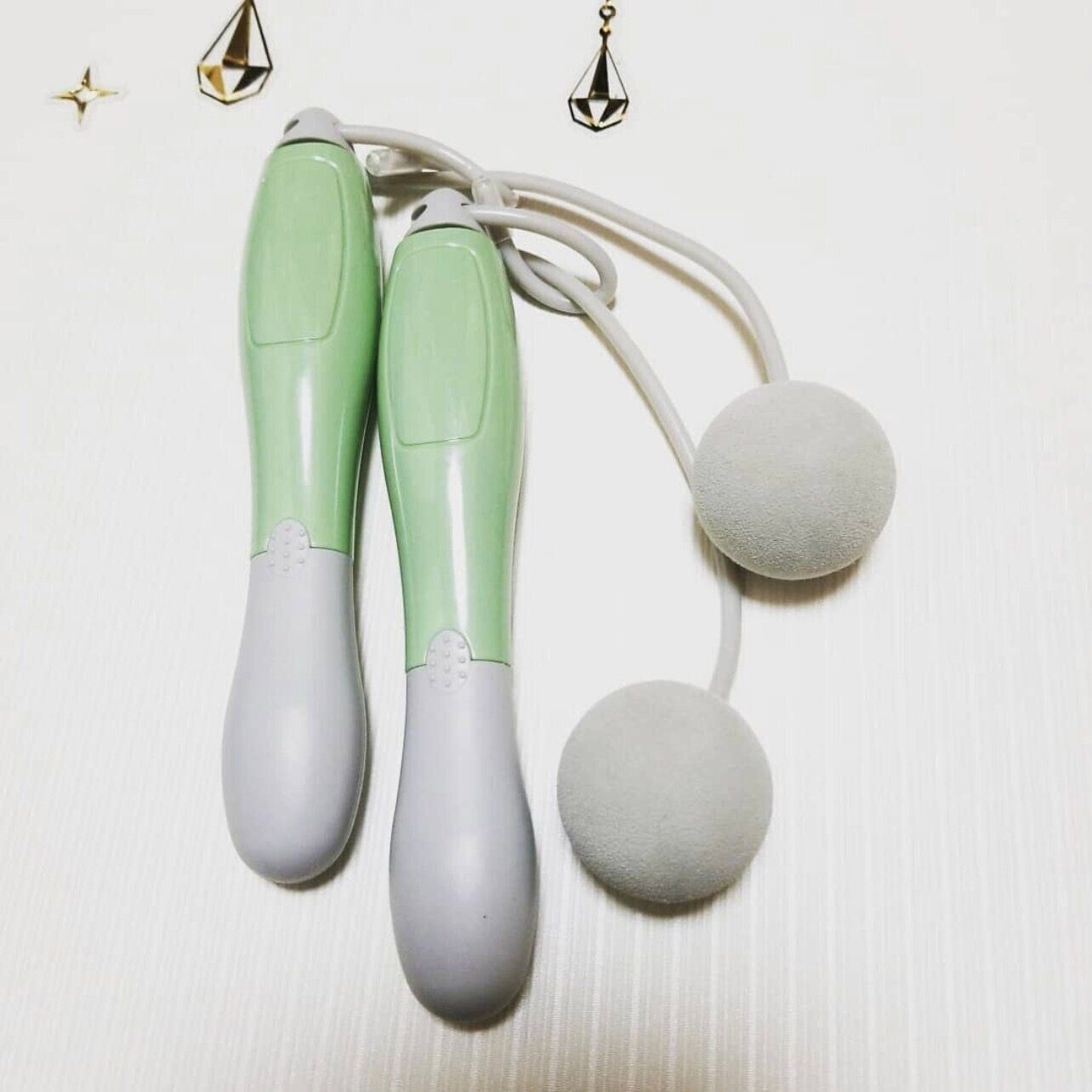 nipochan.igさんが購入したのはエアー縄跳び。グリップの先にボールが付いていて、縄跳びの要領で回せばいいようです。このエアー縄跳びなら縄がフローリングなどを傷める心配もなく、それほど場所を取らないので、おうちの中でも手軽にできそうですよね。