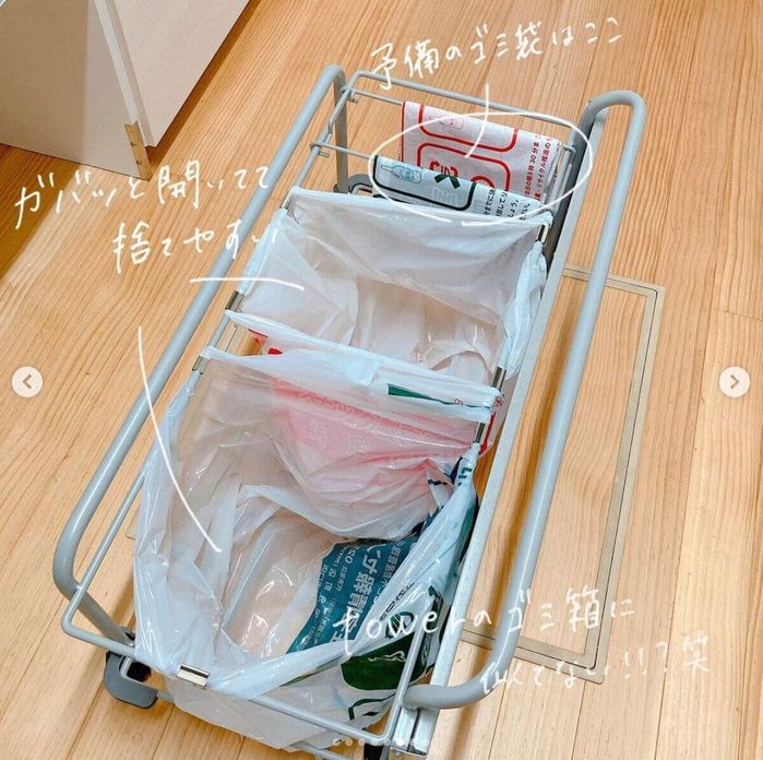 大きなゴミ箱は便利ですが置くスペースやお手入れに困ることも多いですよね。azuさんはキッチンのゴミ箱を撤去して、ゴミ箱スペースにビニール袋をかけるだけにしてみたそう。これならゴミ箱を洗う必要もなくなりますね!