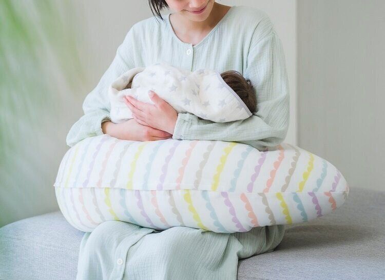 そんな時は「授乳クッション」がオススメ。授乳クッションに赤ちゃんを乗せて抱っこすると、赤ちゃんの位置がママのおっぱいの高さに近づき、ママの背中が伸びて姿勢がとても楽に。赤ちゃんも安定します。