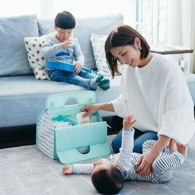 ”お世話導線”を考えた、まさに赤ちゃんのお世話のための専用収納ケース。必要なグッズがひとまとめになっていることで、誰が見てもわかりやすく使いやすいので、家族みんなでお世話をシェアできる点も好評。