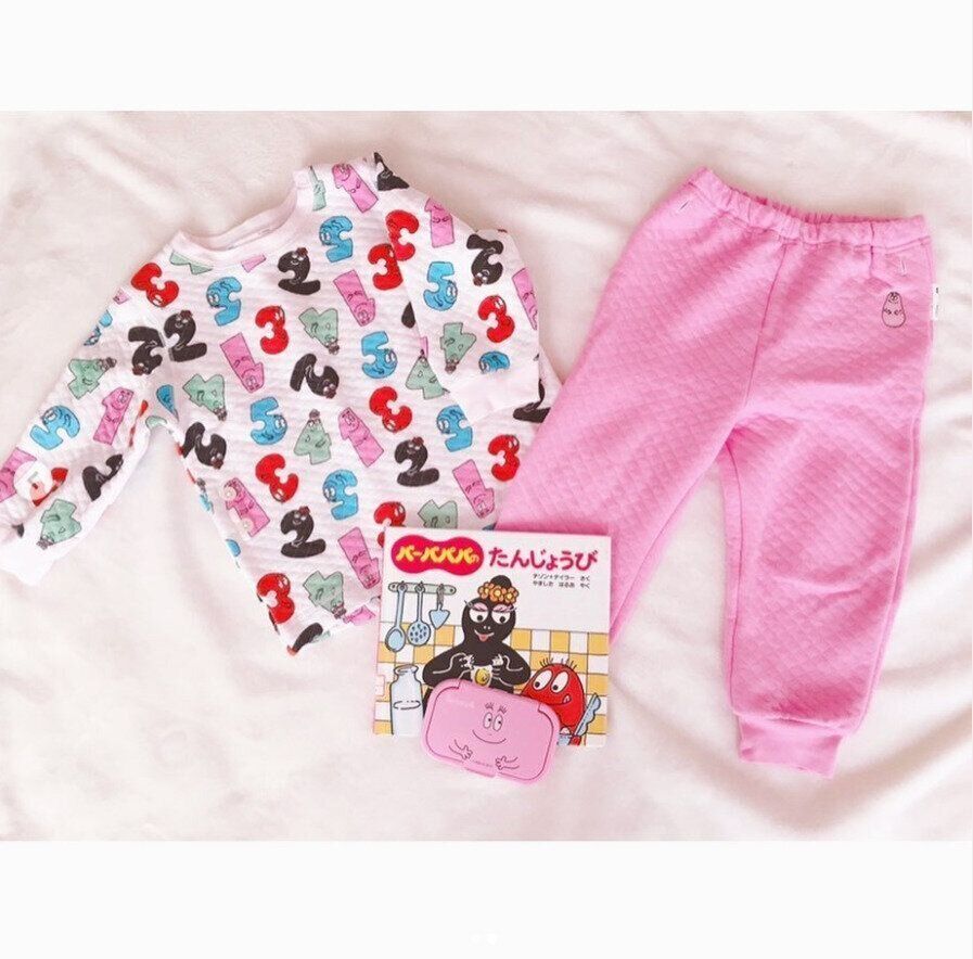こちらはバーバパパたちがたくさんプリントされているパジャマ。絶妙なピンクに癒されるとお気に入りの様子。ズボンの上側にさりげなく付いているバーバパパも可愛らしいですね。