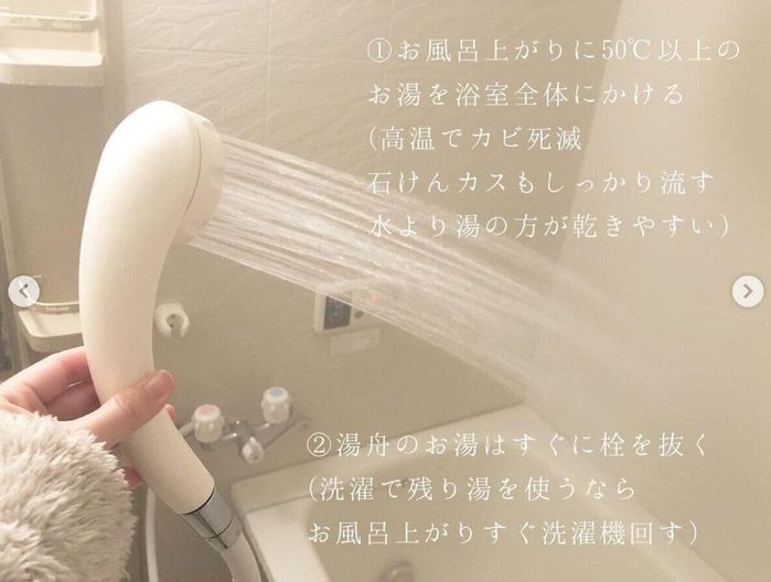 ふぃんさんはお風呂上がりに50℃以上のお湯を浴室全体にかけるそうです。高温でカビを死滅させたり、石鹸カスをしっかり流したりできるとのこと。また、湯舟のお湯は残さずにすぐに流すことも意識しているんだとか!