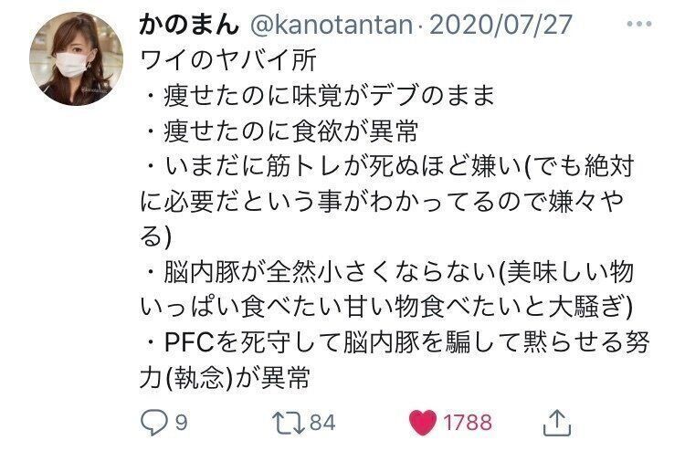 「もちろん、今でも“何か食べたい!”となることはあります。ただ、私の頭の中に住んでいる巨大な脳内豚が『シュークリーム食べたい!』と言って騒ぎ出しても、取りあえずは冷蔵庫にストックしている基本の鶏胸肉やプロテイン蒸しパン(かのまんさん考案の高タンパク、低脂質レシピ)を食べるんです」